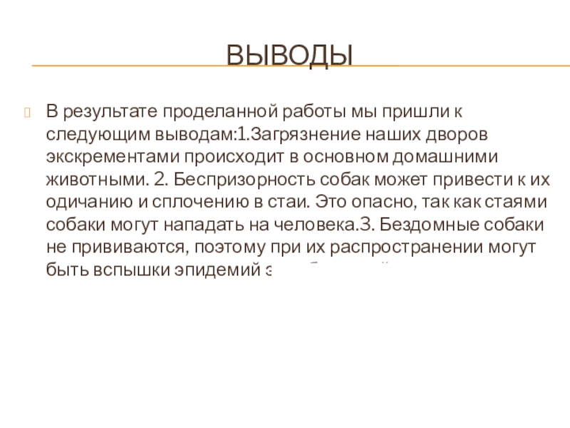 экскрементами происходит в основном домашними животными. 2. Беспризорность собак может привести к их одичанию и сплочению в стаи. Это опасно, так как стаями собаки могут нападать на человека.3. Бездомные собаки не прививаются, поэтому при их распространении могут быть вспышки эпидемий этих болезней.