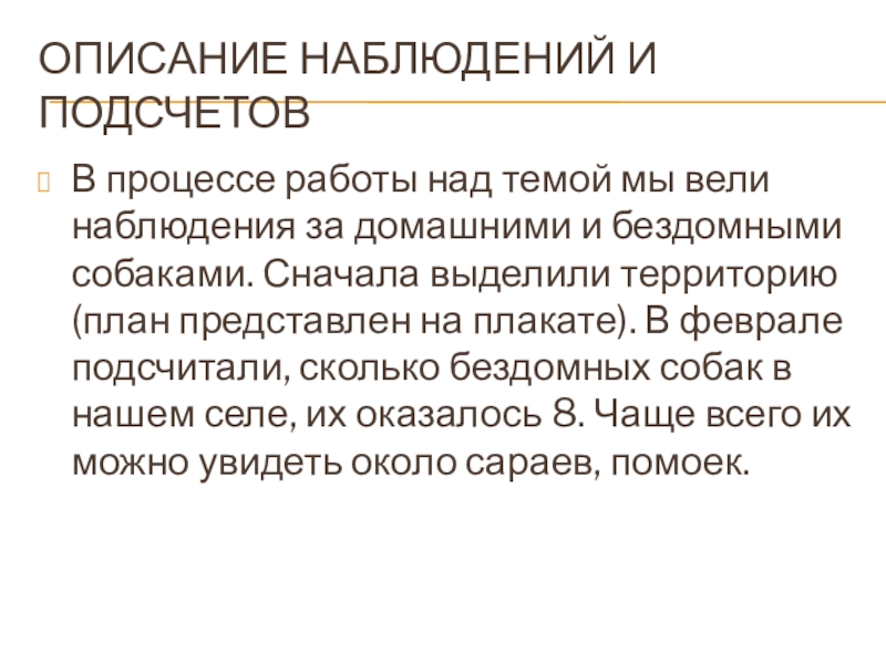 за домашними и бездомными собаками. Сначала выделили территорию (план представлен на плакате). В феврале подсчитали, сколько бездомных собак в нашем селе, их оказалось 8. Чаще всего их можно увидеть около сараев, помоек.