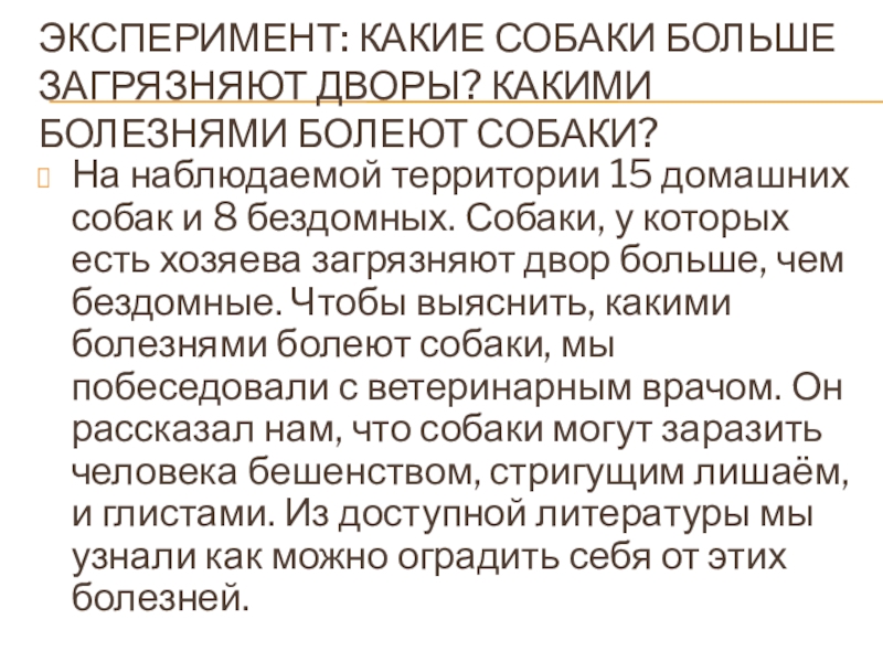 Слайд 9ЭКСПЕРИМЕНТ: КАКИЕ СОБАКИ БОЛЬШЕ ЗАГРЯЗНЯЮТ ДВОРЫ? КАКИМИ БОЛЕЗНЯМИ БОЛЕЮТ СОБАКИ?