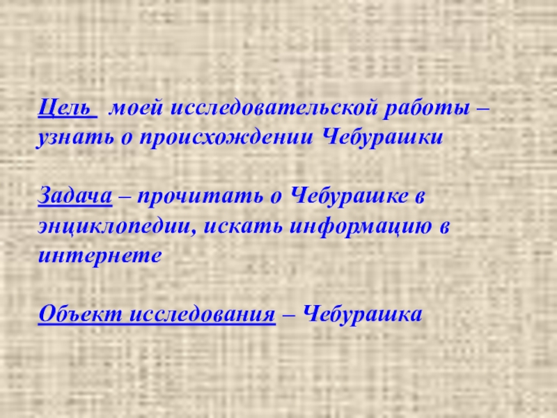 Цель моей исследовательской работы – узнать о происхождении ЧебурашкиЗадача – прочитать о Чебурашке в энциклопедии, искать информацию в интернетеОбъект исследования – Чебурашка