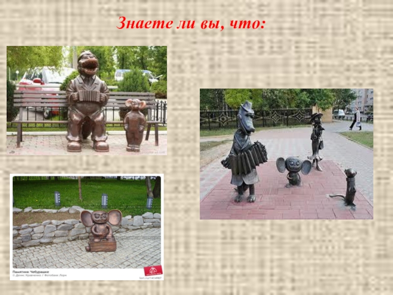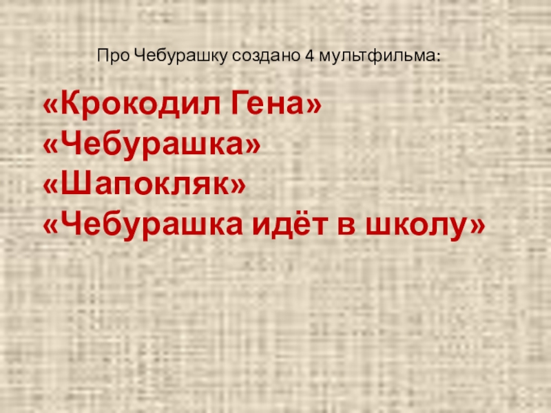 Про Чебурашку создано 4 мультфильма:«Крокодил Гена»«Чебурашка»«Шапокляк»«Чебурашка идёт в школу»