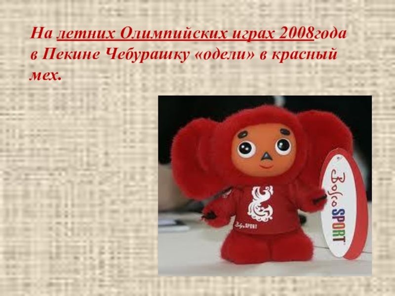 На летних Олимпийских играх 2008года в Пекине Чебурашку «одели» в красный мех.