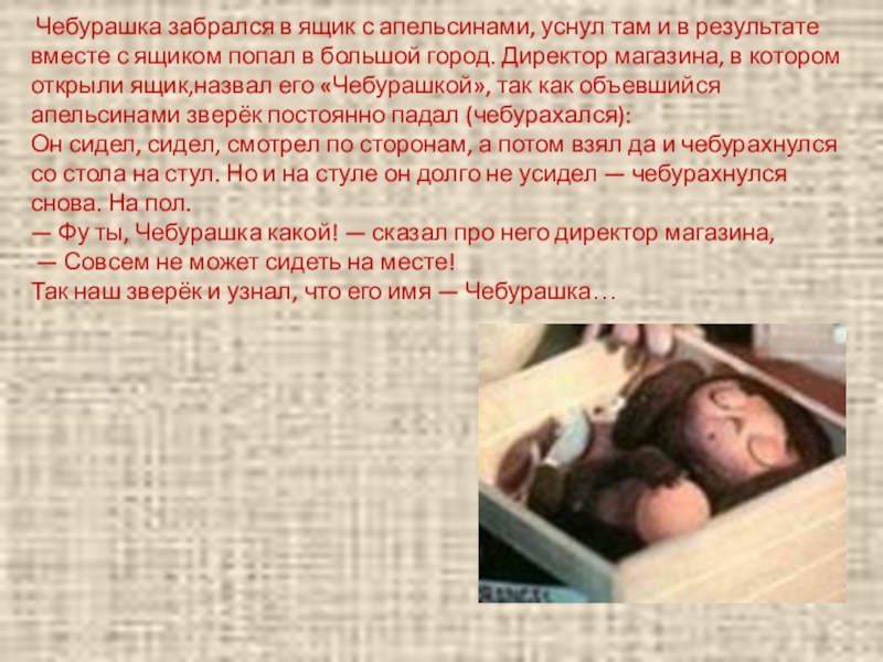 Слайд 5 Чебурашка забрался в ящик с апельсинами, уснул там и в