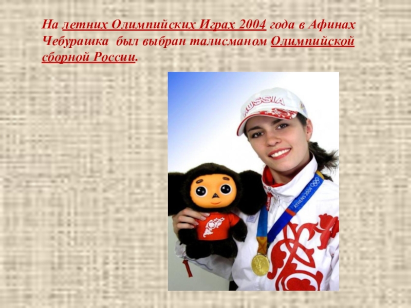 Слайд 8На летних Олимпийских Играх 2004 года в Афинах Чебурашка был выбран талисманом Олимпийской сборной