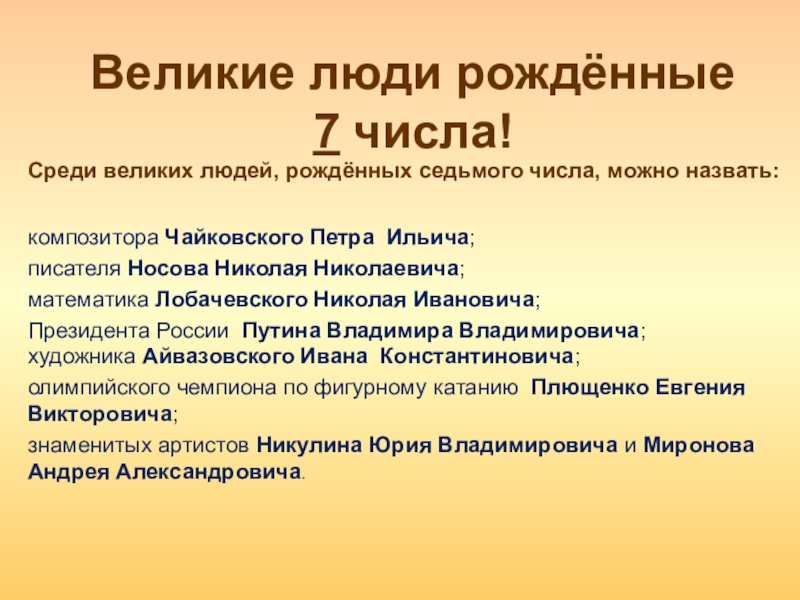 Среди великих людей, рождённых седьмого числа, можно назвать: