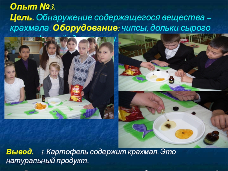Вывод. 1. Картофель содержит крахмал. Это натуральный продукт.