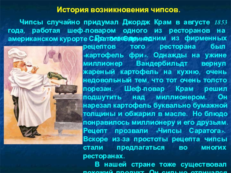 Чипсы случайно придумал Джордж Крам в августе 1853 года, работая шеф-поваром одного из ресторанов на американском курорте Саратога-Спрингс.