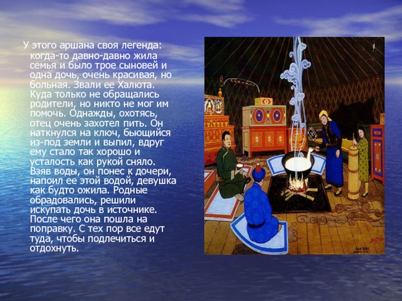 Слайд 9 У этого аршана своя легенда: когда-то давно-давно жила семья и