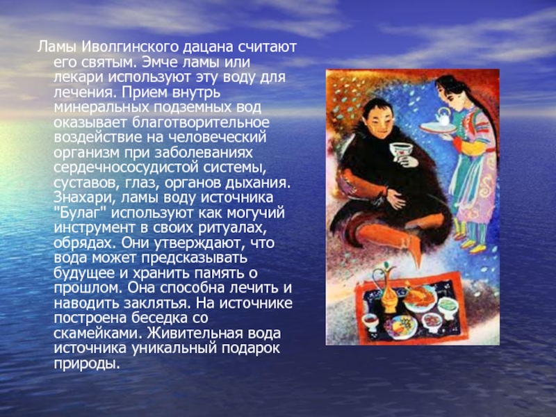 Слайд 7 Ламы Иволгинского дацана считают его святым. Эмче ламы или лекари