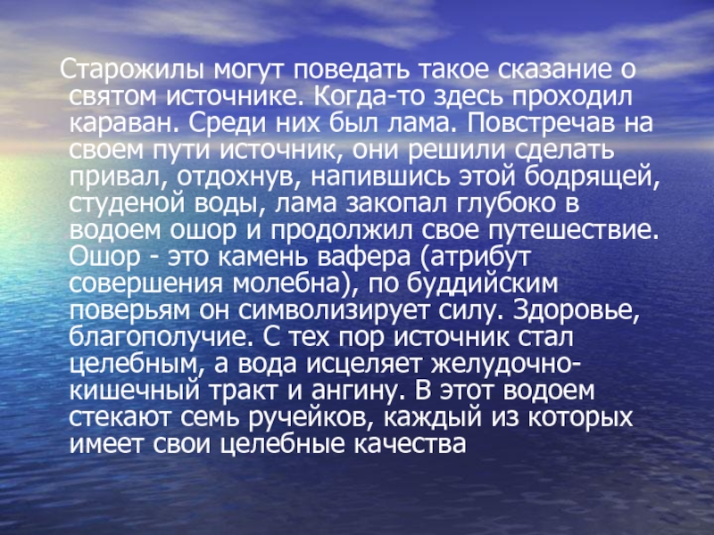 проходил караван. Среди них был лама. Повстречав на своем пути источник, они решили сделать привал, отдохнув, напившись этой бодрящей, студеной воды, лама закопал глубоко в водоем ошор и продолжил свое путешествие. Ошор - это камень вафера (атрибут совершения молебна), по буддийским поверьям он символизирует силу. Здоровье, благополучие. С тех пор источник стал целебным, а вода исцеляет желудочно-кишечный тракт и ангину. В этот водоем стекают семь ручейков, каждый из которых имеет свои целебные качества