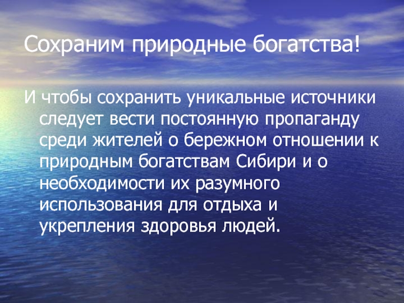Сохраним природные богатства!И чтобы сохранить уникальные источники следует вести постоянную пропаганду среди жителей о бережном отношении к