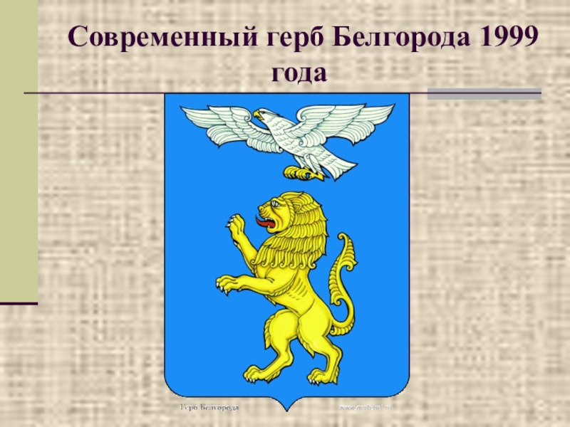 города имеет некоторое отличие — лев лежит. Эмблема меняется в связи с новыми канонами геральдической символики: лев— сила, храбрость; орел — власть, прозорливость; зеленое поле — надежда и изобилие; синее небо — красота, величие.