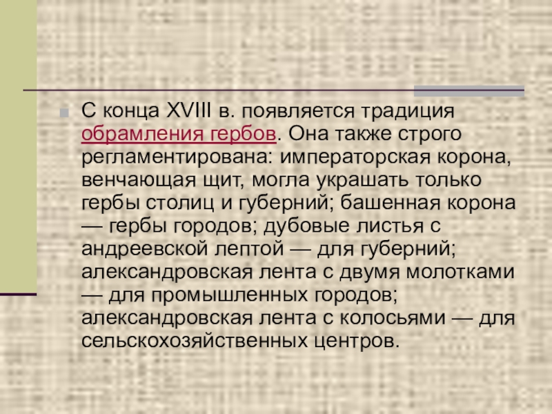 Слайд 5С конца XVIII в. появляется традиция обрамления гербов. Она также строго