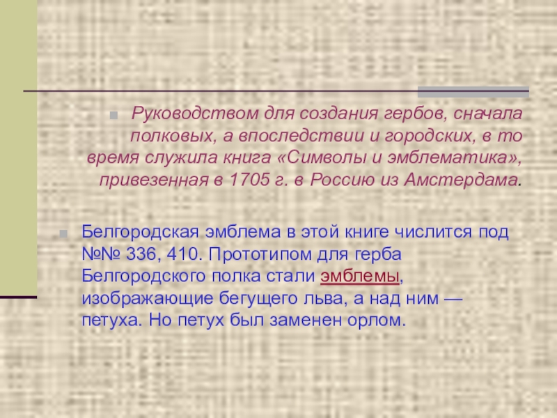 Белгородская эмблема в этой книге числится под №№ 336, 410. Прототипом для герба Белгородского полка стали эмблемы, изображающие бегущего льва, а над ним — петуха. Но петух был заменен орлом.