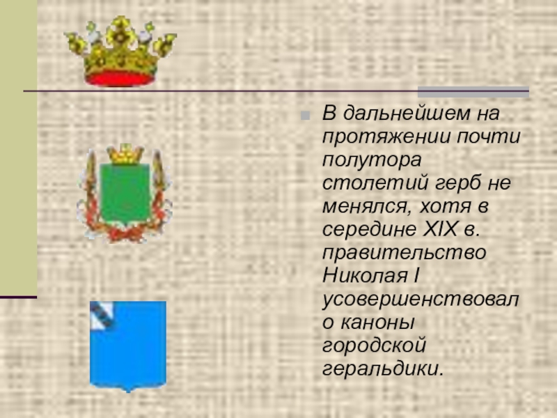 Слайд 12В дальнейшем на протяжении почти полутора столетий герб не менялся, хотя