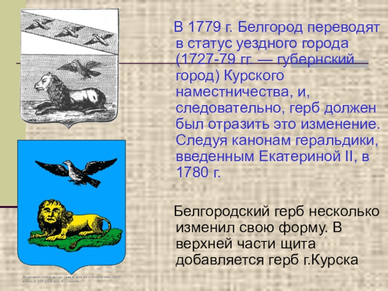 (1727-79 гг. — губернский город) Курского наместничества, и, следовательно, герб должен был отразить это изменение. Следуя канонам геральдики, введенным Екатериной II, в 1780 г.