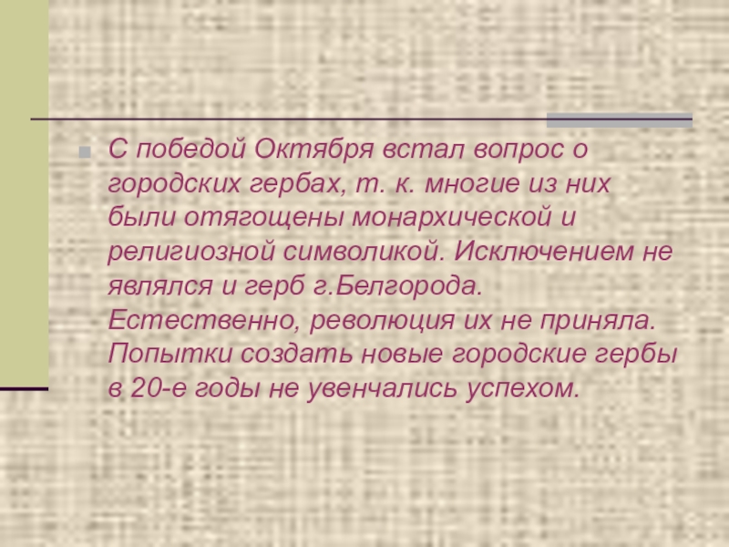 из них были отягощены монархической и религиозной символикой. Исключением не являлся и герб г.Белгорода. Естественно, революция их не приняла. Попытки создать новые городские гербы в 20-е годы не увенчались успехом.