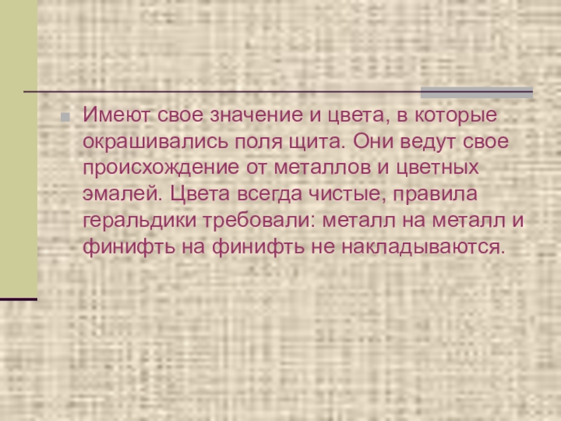 ведут свое происхождение от металлов и цветных эмалей. Цвета всегда чистые, правила геральдики требовали: металл на металл и финифть на финифть не накладываются.