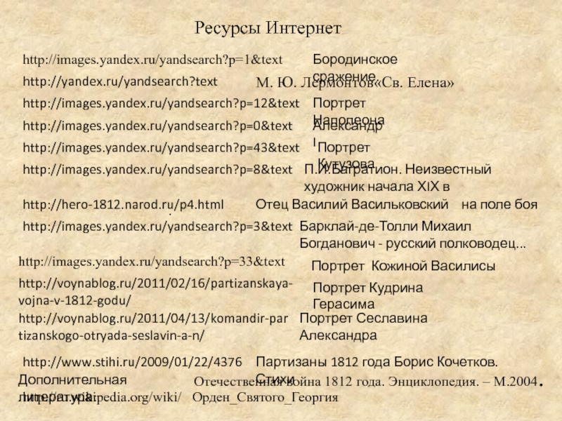 Отечественная война 1812 года. Энциклопедия. – М.2004.