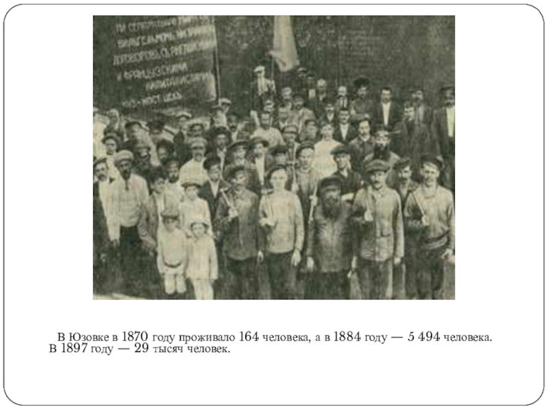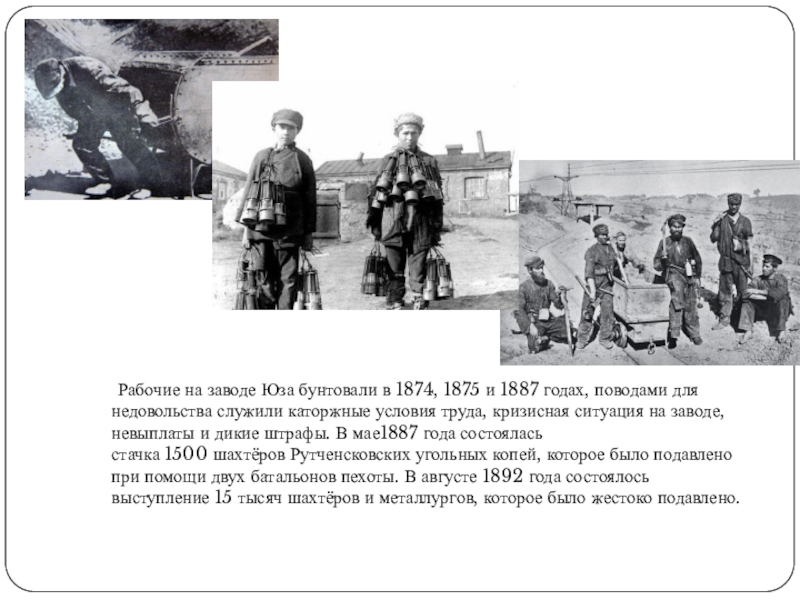 Слайд 13 Рабочие на заводе Юза бунтовали в 1874, 1875