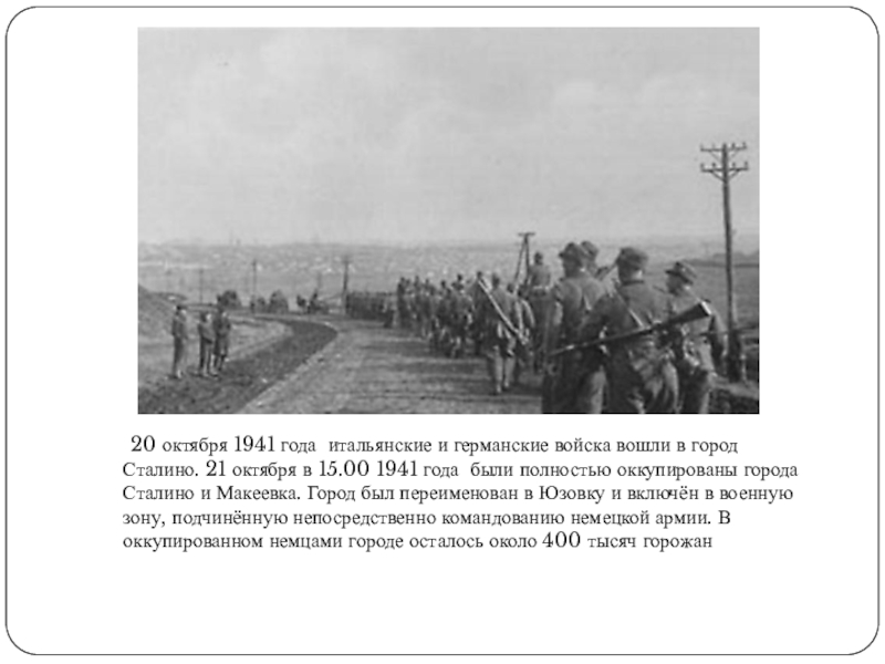 в город Сталино. 21 октября в 15.00 1941 года были полностью оккупированы города Сталино и Макеевка. Город был переименован в Юзовку и включён в военную зону, подчинённую непосредственно командованию немецкой армии. В оккупированном немцами городе осталось около 400 тысяч горожан