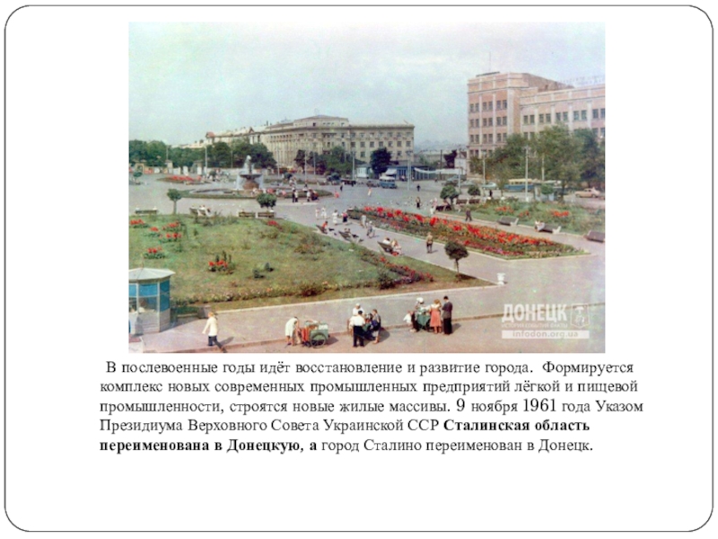 Формируется комплекс новых современных промышленных предприятий лёгкой и пищевой промышленности, строятся новые жилые массивы. 9 ноября 1961 года Указом Президиума Верховного Совета Украинской ССР Сталинская область переименована в Донецкую, а город Сталино переименован в Донецк.