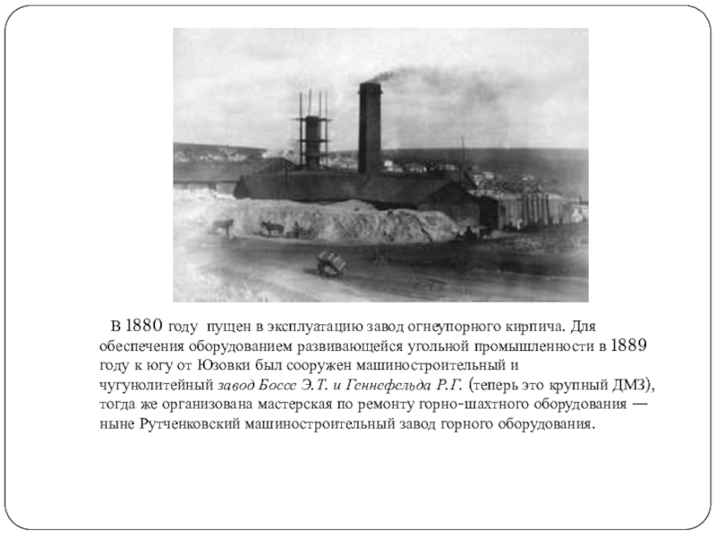 кирпича. Для обеспечения оборудованием развивающейся угольной промышленности в 1889 году к югу от Юзовки был сооружен машиностроительный и чугунолитейный завод Боссе Э.Т. и Геннефельда Р.Г. (теперь это крупный ДМЗ), тогда же организована мастерская по ремонту горно-шахтного оборудования — ныне Рутченковский машиностроительный завод горного оборудования.