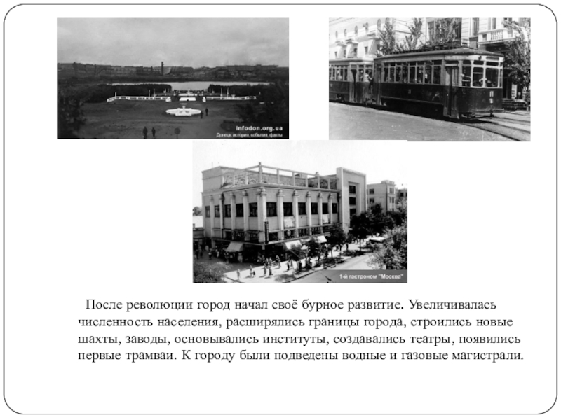 численность населения, расширялись границы города, строились новые шахты, заводы, основывались институты, создавались театры, появились первые трамваи. К городу были подведены водные и газовые магистрали.