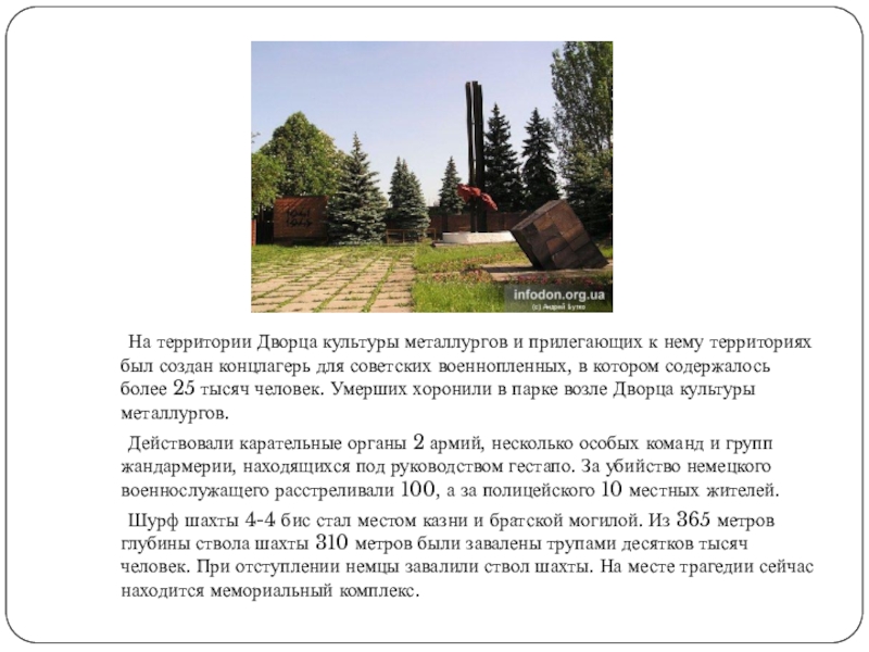 нему территориях был создан концлагерь для советских военнопленных, в котором содержалось более 25 тысяч человек. Умерших хоронили в парке возле Дворца культуры металлургов.