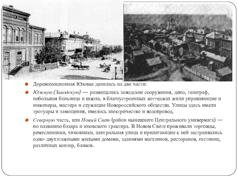 Северную часть, или Новый Свет (район нынешнего Центрального универмага) — по названию базара и юзовского трактира. В Новом Свете проживали торговцы, ремесленники, чиновники, центральная улица и прилегающие к ней застраивались одно-двухэтажными жилыми домами, зданиями магазинов, ресторанов, гостиниц, различных контор, банков.