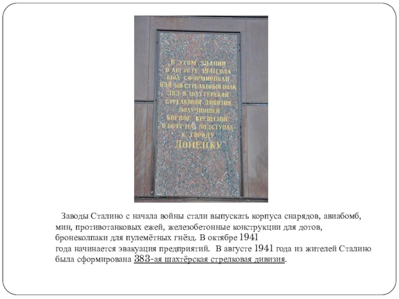 корпуса снарядов, авиабомб, мин, противотанковых ежей, железобетонные конструкции для дотов, бронеколпаки для пулемётных гнёзд. В октябре 1941 года начинается эвакуация предприятий. В августе 1941 года из жителей Сталино была сформирована 383-ая шахтёрская стрелковая дивизия.