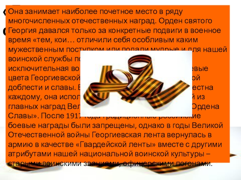 многочисленных отечественных наград. Орден святого Георгия давался только за конкретные подвиги в военное время «тем, кои… отличили себя особливым каким мужественным поступком или подали мудрые и для нашей воинской службы полезные советы». Это была исключительная воинская награда. Черно-оранжевые цвета Георгиевской ленты стали символом военной доблести и славы. Ее цветовая гамма хорошо известна каждому, она использовалась при создании одной из главных наград Великой отечественной войны - «Ордена Славы». После 1917 года традиционные российские боевые награды были запрещены, однако в годы Великой Отечественной войны Георгиевская лента вернулась в армию в качестве «Гвардейской ленты» вместе с другими атрибутами нашей национальной воинской культуры – старыми воинскими званиями, офицерскими погонами.