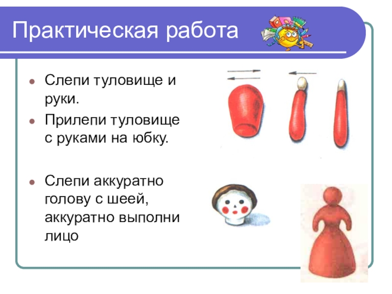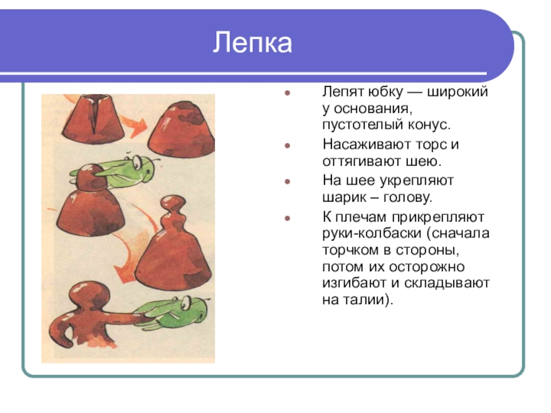 К плечам прикрепляют руки-колбаски (сначала торчком в стороны, потом их осторожно изгибают и складывают на талии).