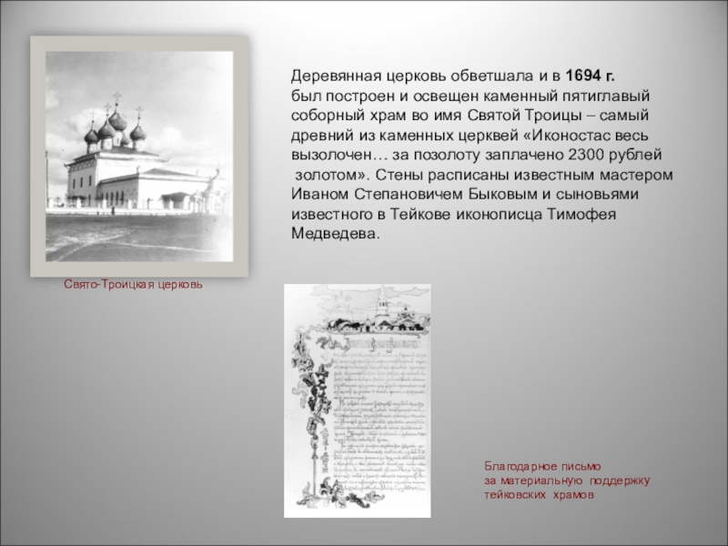 Согласно записям в Писцовых- переписных книгах «Суздальского письма и меры Михаила Трусова и Дьяка Феодора Витовтова» за 1623-1630 годы, по жалованной грамоте, выданной царем Михаилом Федоровичем, село Тейково