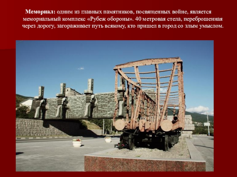Слайд 26Мемориал: одним из главных памятников, посвященных войне, является мемориальный комплекс «Рубеж обороны».