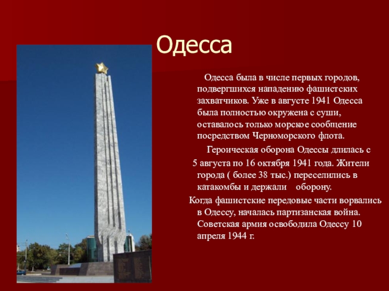 Когда фашистские передовые части ворвались в Одессу, началась партизанская война. Советская армия освободила Одессу 10 апреля 1944 г.