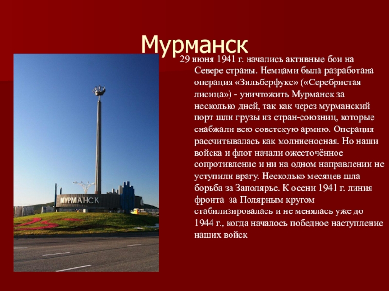 Немцами была разработана операция «Зильберфукс» («Серебристая лисица») - уничтожить Мурманск за несколько дней, так как через мурманский порт шли грузы из стран-союзниц, которые снабжали всю советскую армию. Операция рассчитывалась как молниеносная. Но наши войска и флот начали ожесточённое сопротивление и ни на одном направлении не уступили врагу. Несколько месяцев шла борьба за Заполярье. К осени 1941 г. линия фронта за Полярным кругом стабилизировалась и не менялась уже до 1944 г., когда началось победное наступление наших войск
