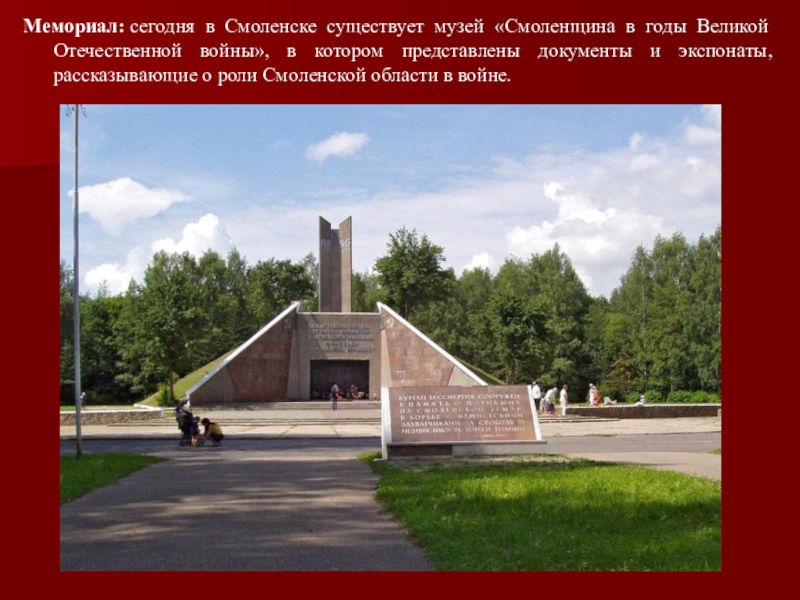 Слайд 39Мемориал: сегодня в Смоленске существует музей «Смоленщина в годы Великой Отечественной войны»,