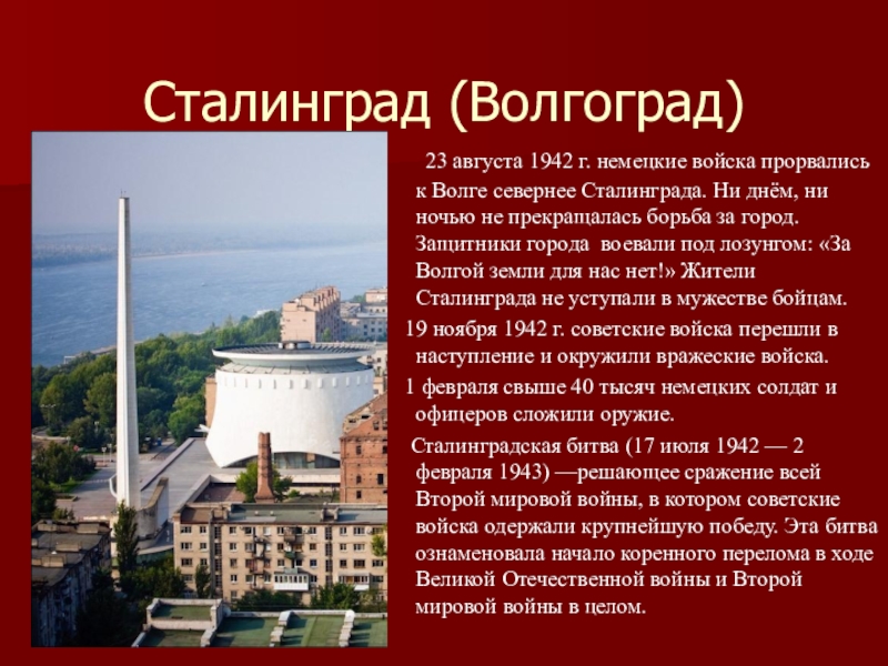 Сталинградская битва (17 июля 1942 — 2 февраля 1943) —решающее сражение всей Второй мировой войны, в котором советские войска одержали крупнейшую победу. Эта битва ознаменовала начало коренного перелома в ходе Великой Отечественной войны и Второй мировой войны в целом.