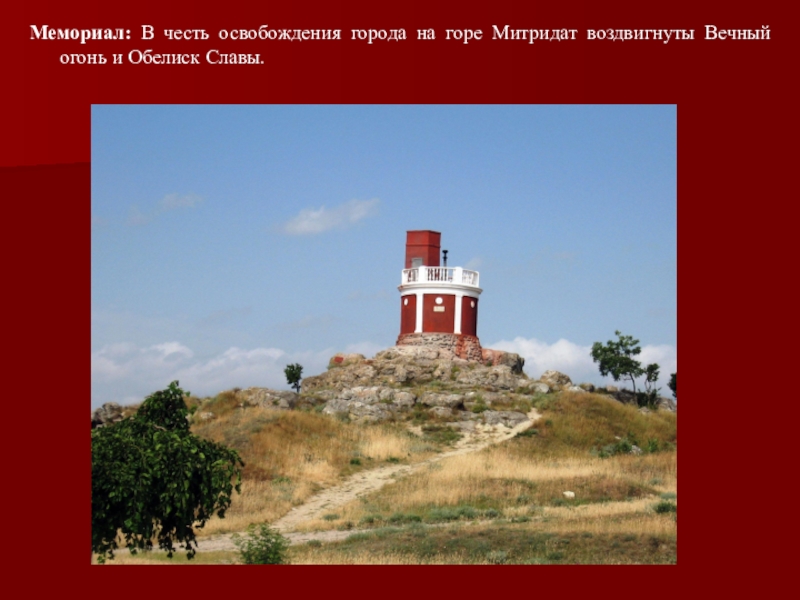Слайд 23Мемориал: В честь освобождения города на горе Митридат воздвигнуты Вечный огонь