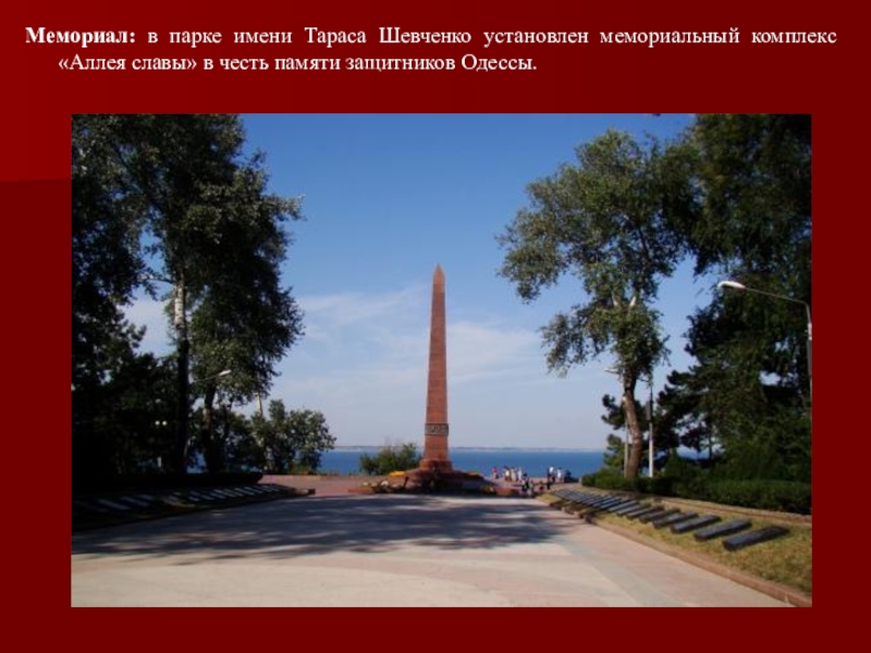 Слайд 10Мемориал: в парке имени Тараса Шевченко установлен мемориальный комплекс «Аллея славы»