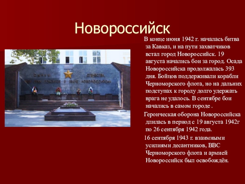за Кавказ, и на пути захватчиков встал город Новороссийск. 19 августа начались бои за город. Осада Новороссийска продолжалась 393 дня. Бойцов поддерживали корабли Черноморского флота, но на дальних подступах к городу долго удержать врага не удалось. В сентябре бои начались в самом городе .