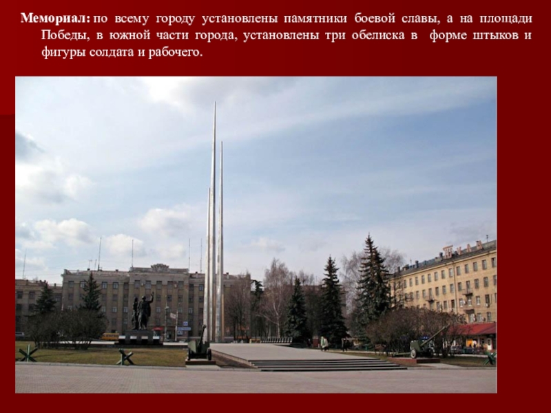 Слайд 33Мемориал: по всему городу установлены памятники боевой славы, а на площади Победы,
