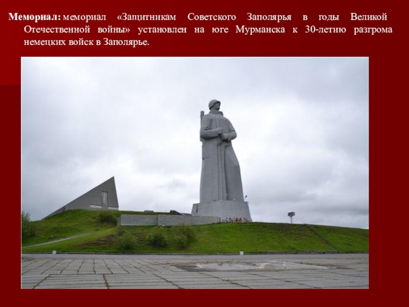 Слайд 37Мемориал: мемориал «Защитникам Советского Заполярья в годы Великой Отечественной войны» установлен на