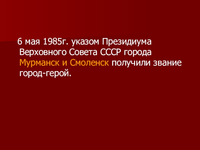 Слайд 35 6 мая 1985г. указом Президиума Верховного Совета СССР города Мурманск
