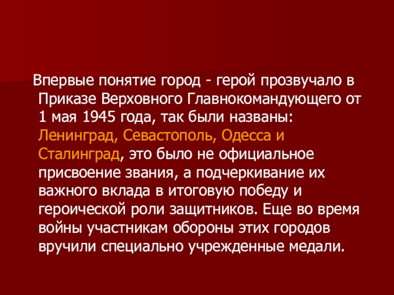 от 1 мая 1945 года, так были названы: Ленинград, Севастополь, Одесса и Сталинград, это было не официальное присвоение звания, а подчеркивание их важного вклада в итоговую победу и героической роли защитников. Еще во время войны участникам обороны этих городов вручили специально учрежденные медали.