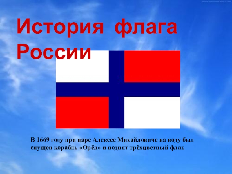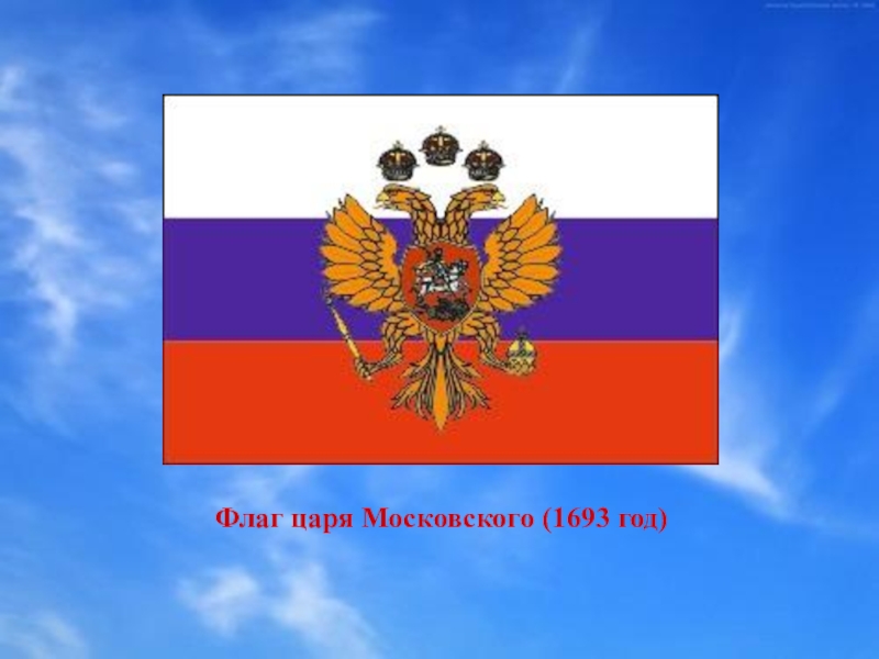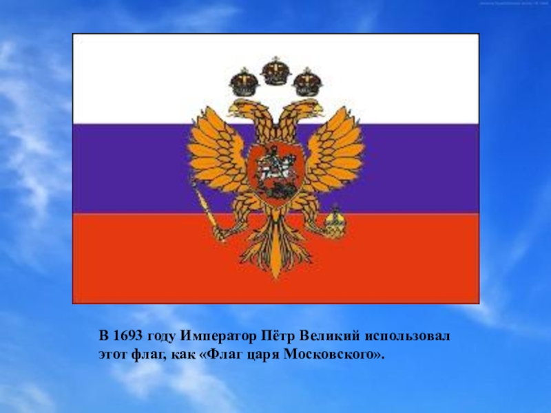 6 августа 1693 года на 12-ти пушечной яхте «Святой Пётр» впервые был поднят в качестве штандарта, так называемый «Флаг царя Московского» - полотнище, состоящее из трёх горизонтальных полос белого, синего и красного цветов с золотым двуглавым орлом посередине. Такой флаг, аналогичный современному русскому флагу, стал использоваться в качестве морского флага России.
