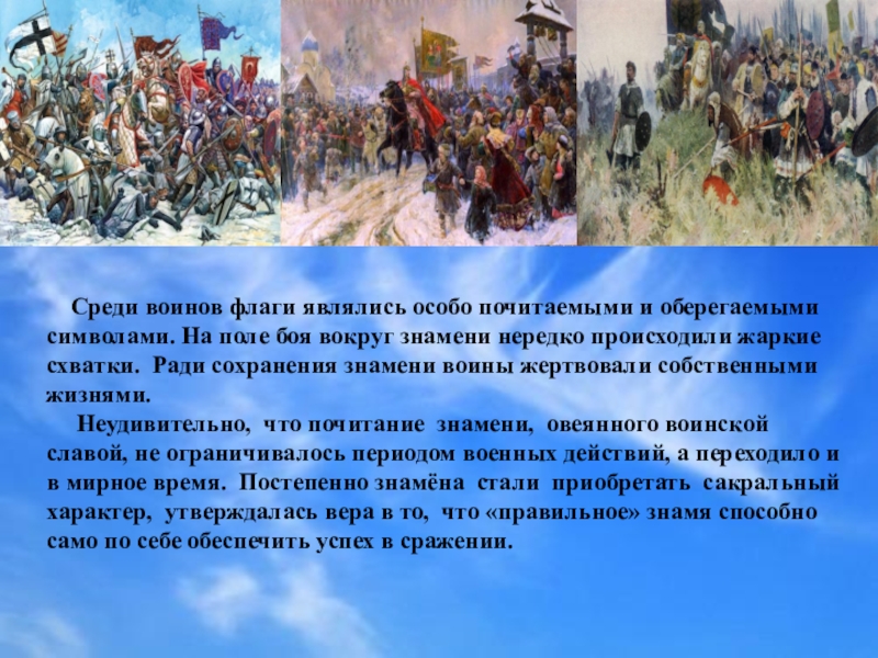 место сбора, по их состоянию нередко определяли ход сражения. Падение знамени или его захват противником нередко означало поражение в битве, напротив, водружение своего знамени на территории врага означало победу.
