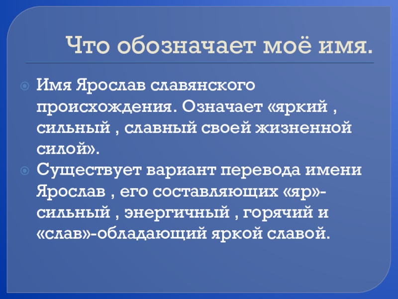 Что обозначает моё имя.Имя Ярослав славянского происхождения. Означает «яркий , сильный , славный своей жизненной силой».Существует вариант
