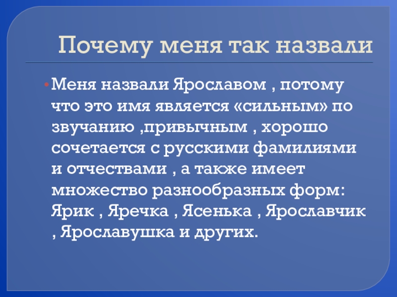 Почему меня так назвалиМеня назвали Ярославом , потому что это имя является «сильным» по звучанию ,привычным , хорошо сочетается с русскими фамилиями и отчествами , а также имеет множество разнообразных форм: Ярик , Яречка , Ясенька